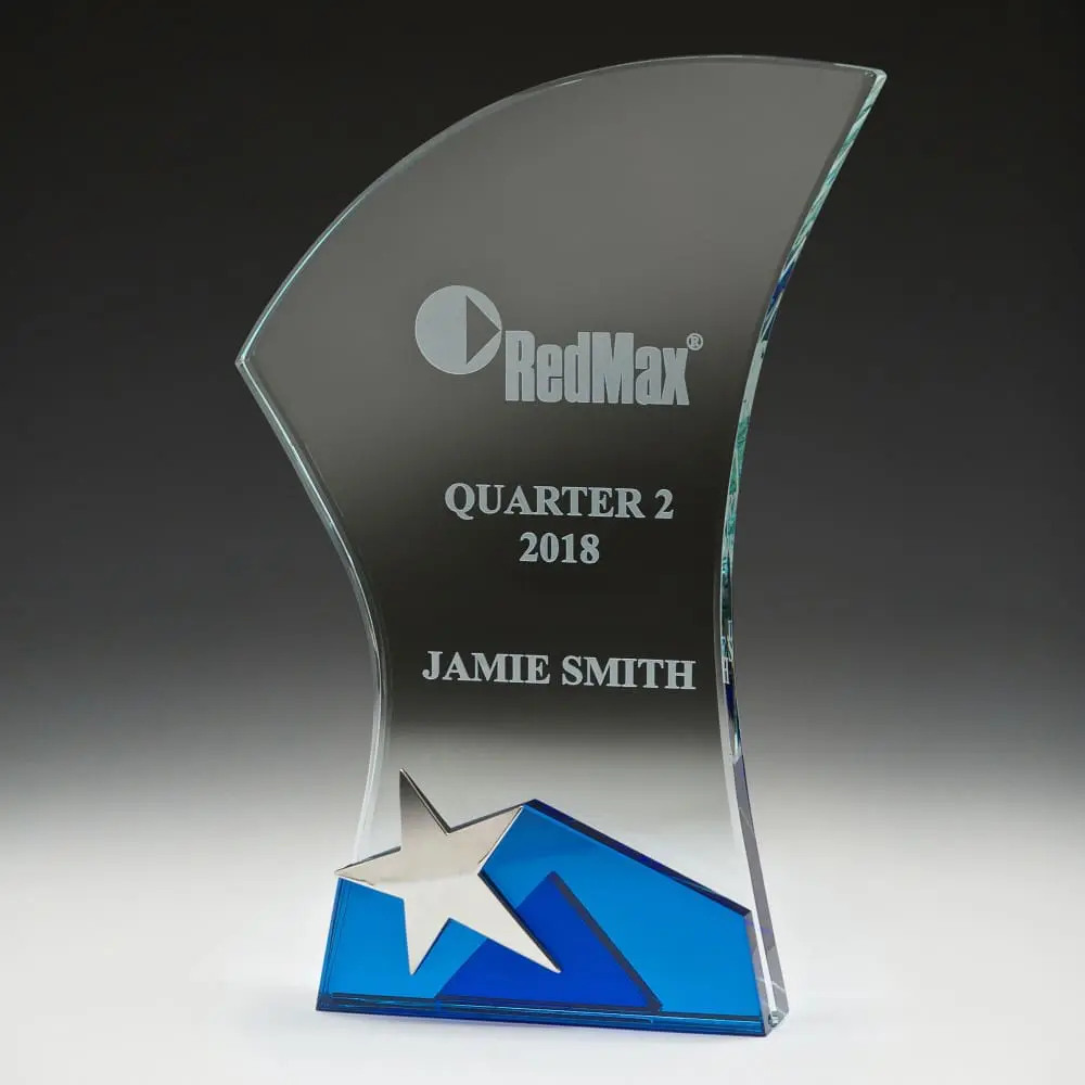 Glass Bluestar Nova, 15mm Thick Glass with Blue Base Feature & Decorative Metal Star. Comes with presentation box.